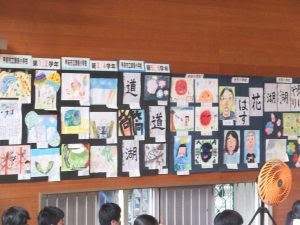 体育館には、美術部が日頃の活動で作った作品や、池田・舞鶴小学校からの作品の展示もありました。休憩時間には多くの生徒が作品を見ていました。