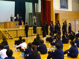 5校時終了後には、後期学級役員の任命式、新人戦を初めとする各種大会の表彰が行われました。校長からは、「学校では、教科の学習とともに、合唱祭への取組や学級の活動など、仲間との関わりを通して多くのことを学んで欲しい」と全校生徒に伝えました。